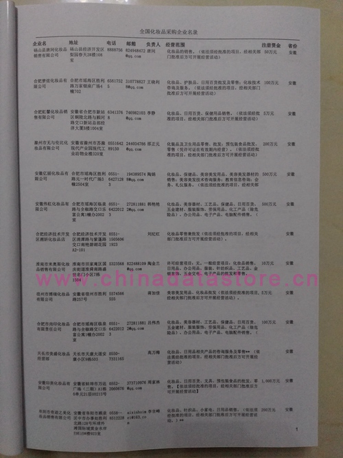 2024年新版中国化妆品采购企业黄页,收录了全国各地经营范围涉及化妆品产品的贸易企业,这些都是颇具实力的化妆品产品的中国采购商。黄页内容包含:企业名称、地址、电话、传真、邮箱、经营范围、省份、注册资金等信息。该套黄页包含一个黄页光碟加一册纸质书刊,全国价格:1500元,省/直辖市价格:400元,城市价格:200元,共收录了全国各地大概28010(统计日期:2018.1)家化妆品产品采购企业。黄页光碟中是EXCEL格式,信息可任意修改、复制、打印、导出及导入到传真、邮件群发等软件中,无任何限制。